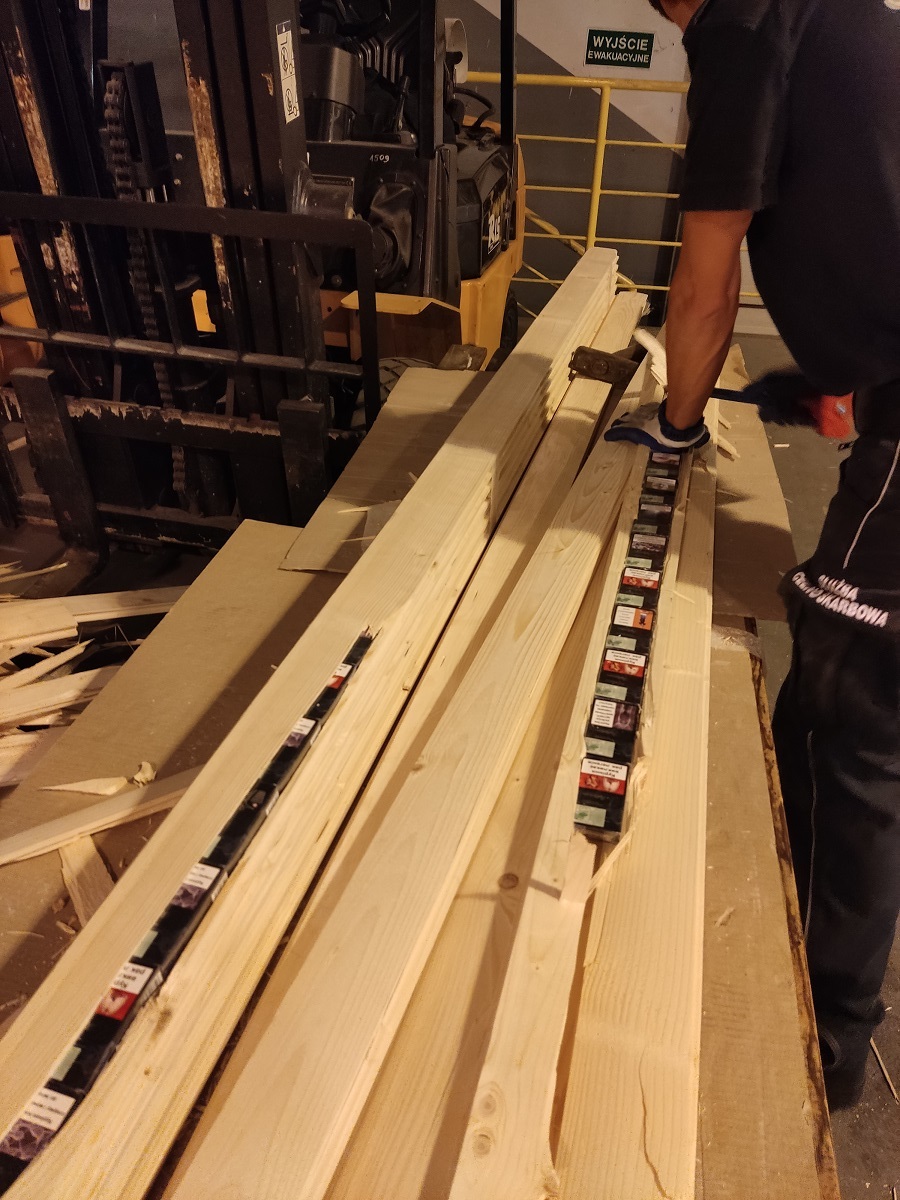 W wyniku szczegółowej rewizji w specjalnie przygotowanych deskach funkcjonariusze wykryli papierosy. W czynnościach uczestniczył pies służbowy.