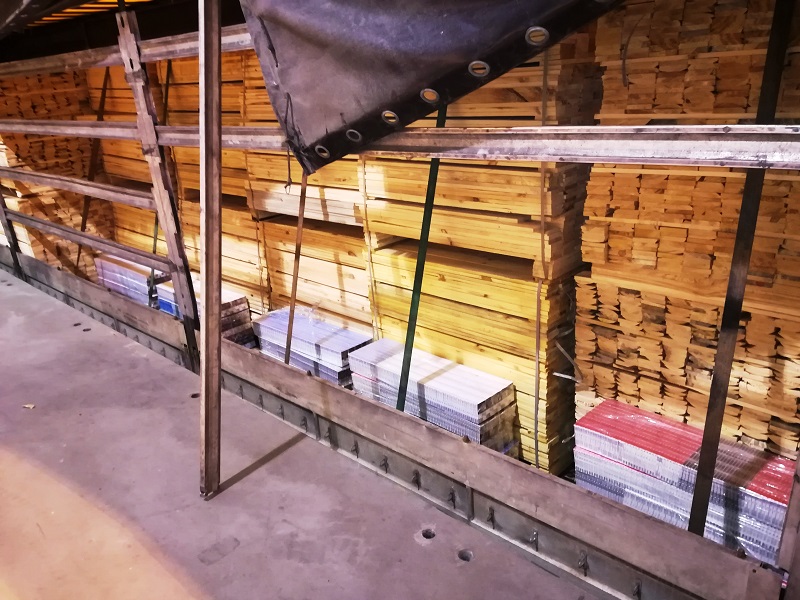 Wyroby tytoniowe funkcjonariusze KAS i SG ujawnili w samochodzie ciężarowym przewożącym legalny ładunek desek z Białorusi. Papierosy, czterech różnych marek, ukryte były w przestrzeni ładunkowej naczepy - wzdłuż bocznej ściany, za paletami z deskami.