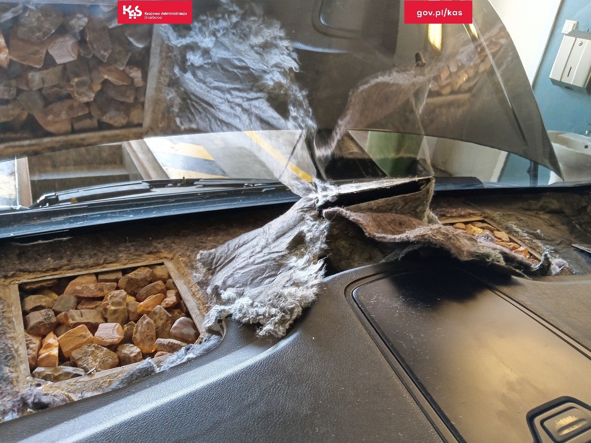 Na bryły bursztynu funkcjonariusze Służby Celno-Skarbowej trafili podczas kontroli osobowego forda, którym podróżowała do Polski obywatelka Ukrainy. Przemycany towar ukryty był w przerobionej desce rozdzielczej i w przerobionych progach pojazdu.