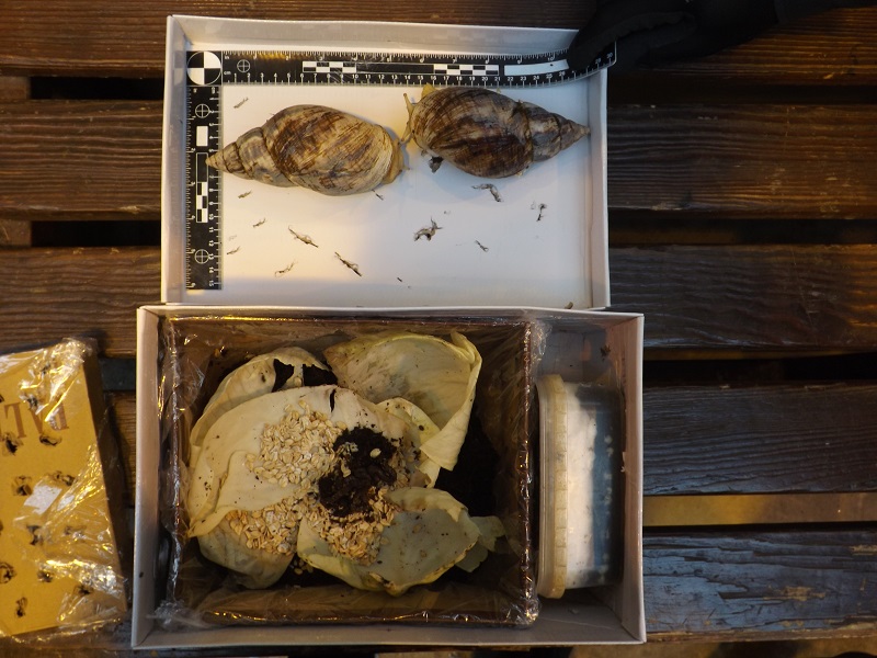 Funkcjonariusze KAS z Hrebennego, kontrolujący pojazdy wjeżdżające do Polski, znaleźli w bagażu 40-latka z Ukrainy pudełko z dwoma żywymi ślimakami z rodzaju Achatina oraz… 147 jajami ślimaka Achatina.