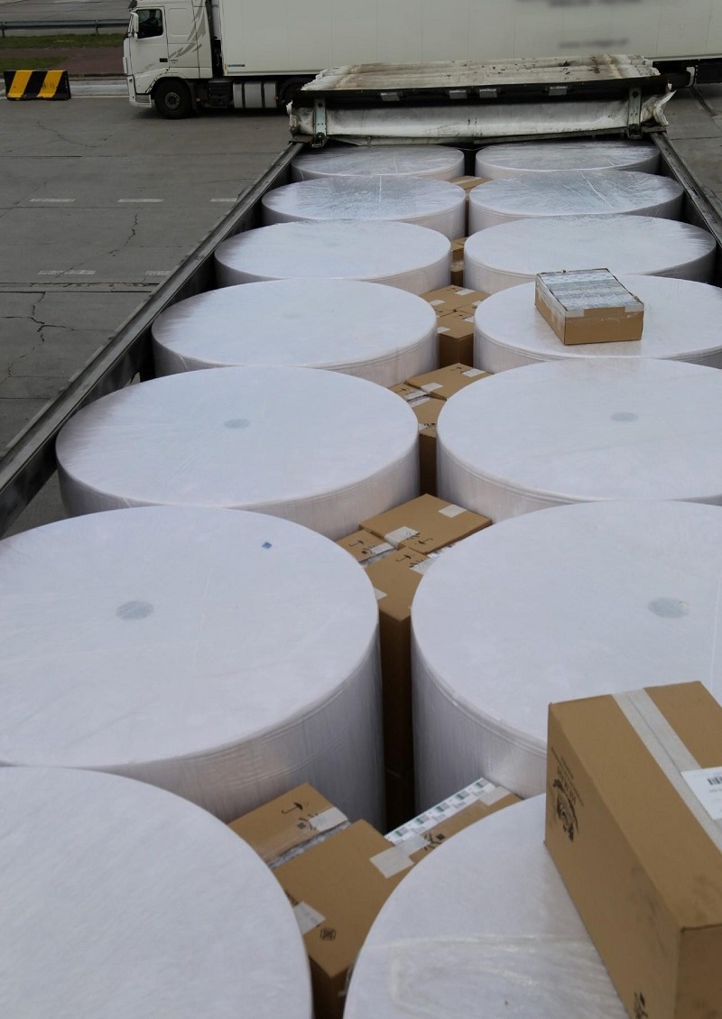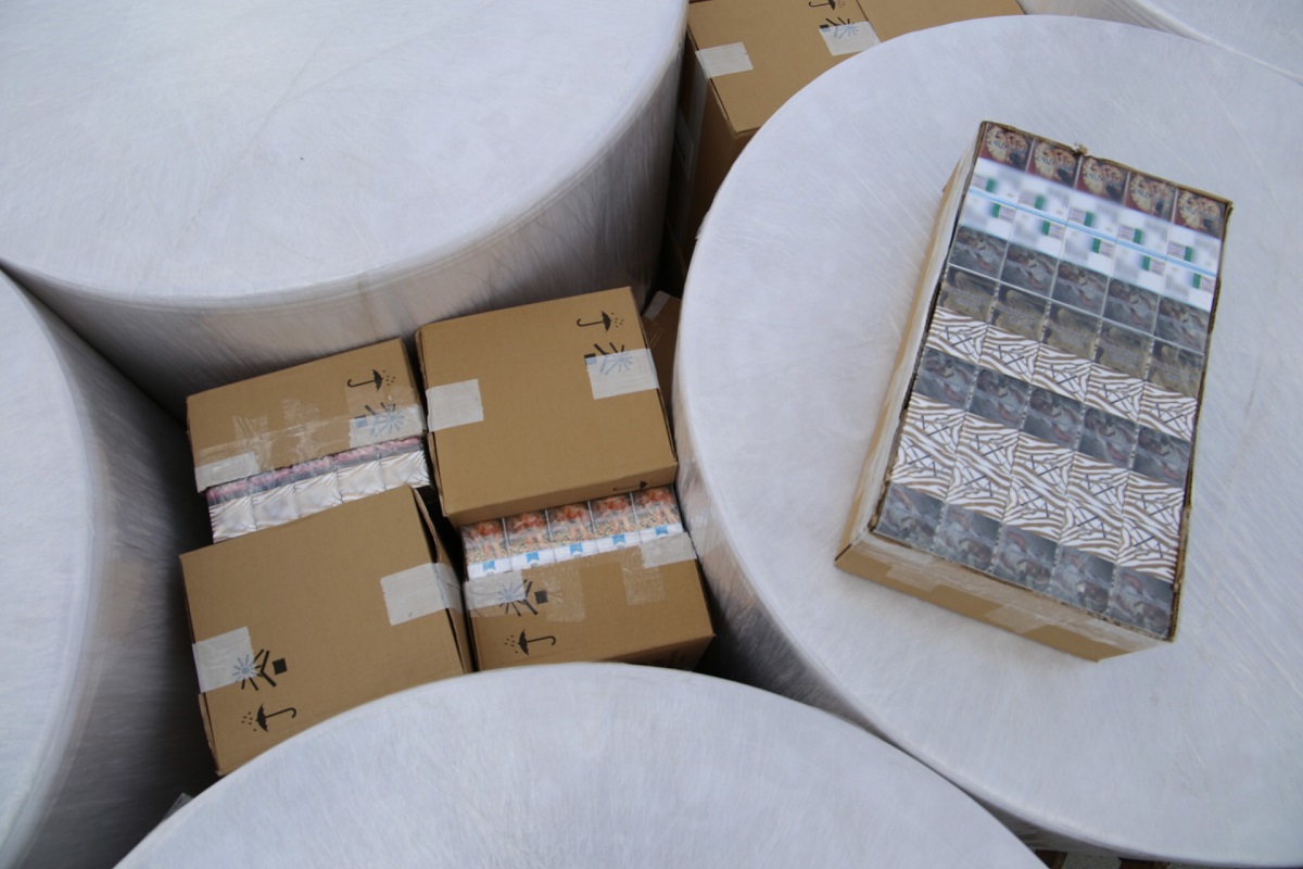 Przeszukali przestrzeń ładunkową pojazdu, gdzie wykryli 58 tys. paczek papierosów bez polskich znaków akcyzy. Nielegalny ładunek ukryty był w kartonowych pudłach między belami papieru.