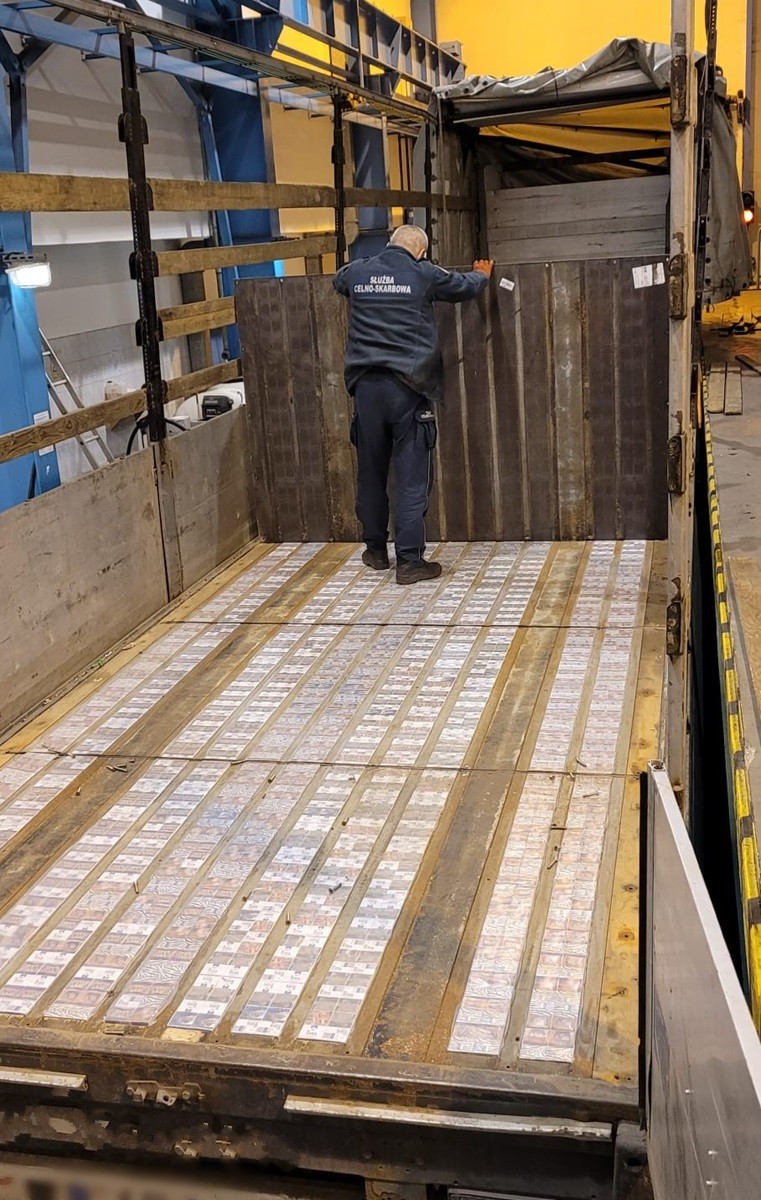 Naczepa, którą przewożono z Kazachstanu ładunek pelletu z łuski słonecznika, posiadała specjalną skrytkę konstrukcyjną w podłodze. Ukryte tam były nielegalne papierosy.