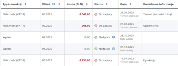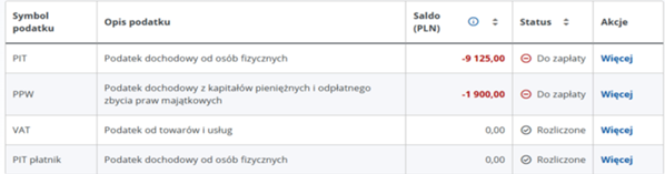 - sprawdzić aktualne salda podatków,