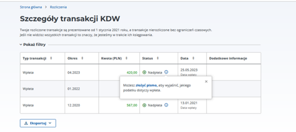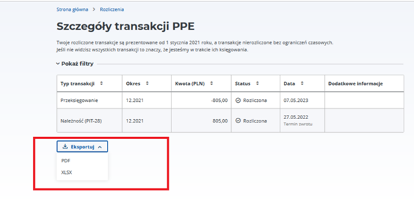 - pobrać dane o rozliczeniach do plików PDF lub XLSX,