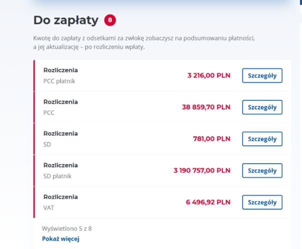 - zobaczyć informacje o pobranych odsetkach, kosztach upomnieniach i wystawionych tytułach wykonawczych,