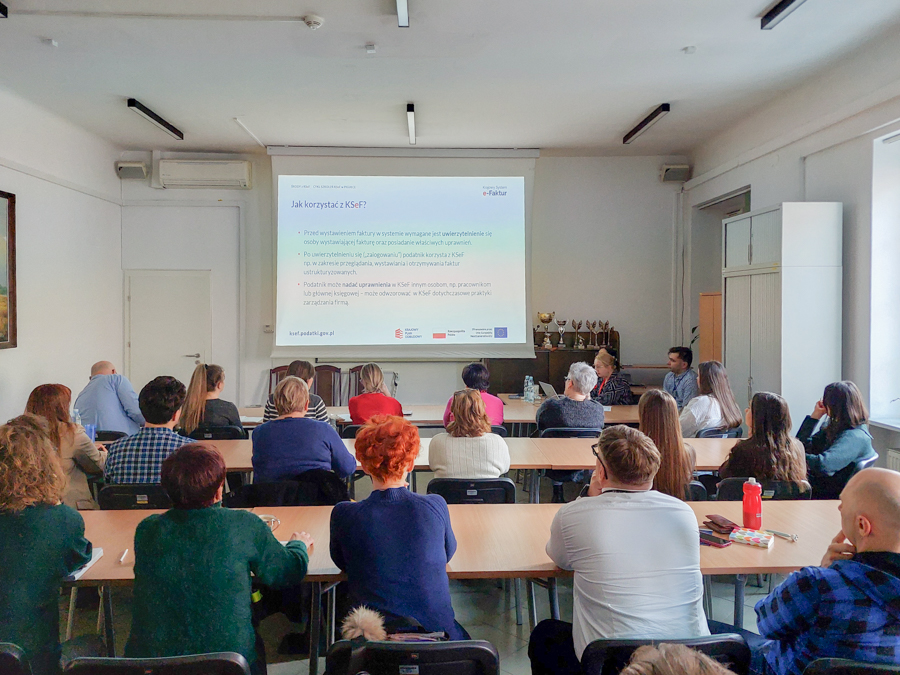 Spotkanie poświęcone było korzystaniu z Krajowego Systemu e-Faktur i obejmowało praktyczne informacje dotyczące logowania, wystawiania i przeglądania faktur ustrukturyzowanych oraz nadawania i zarządzania uprawnieniami w systemie.
