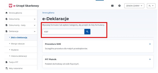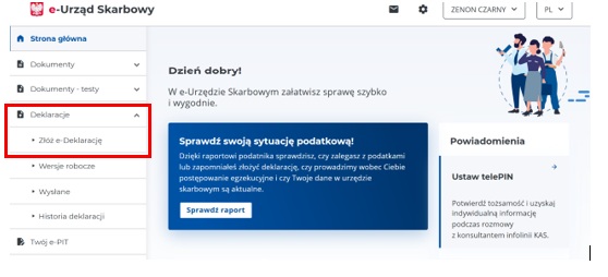 - W menu bocznym wybierz „Deklaracje", a następnie „Złóż e-Deklarację":
