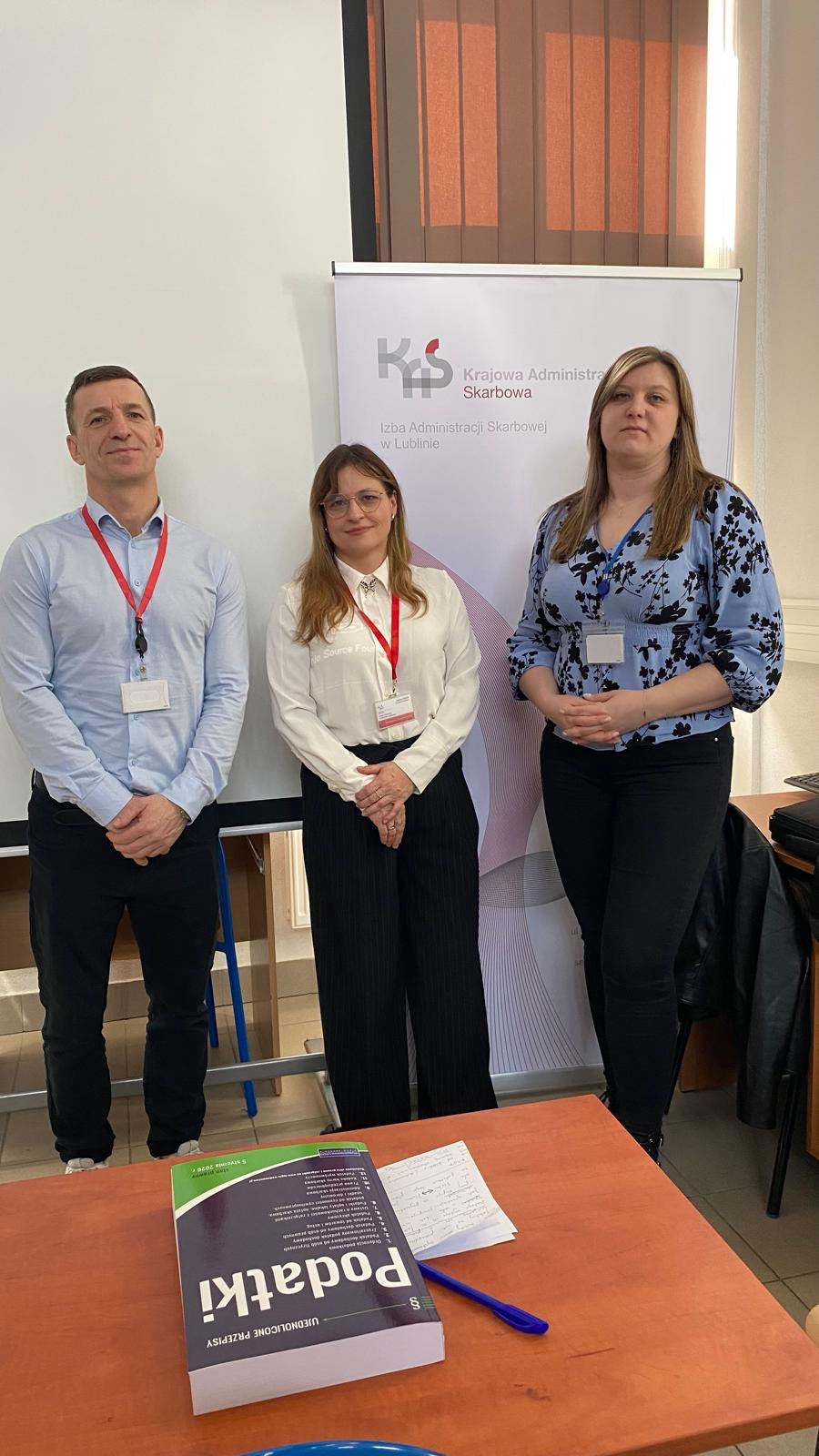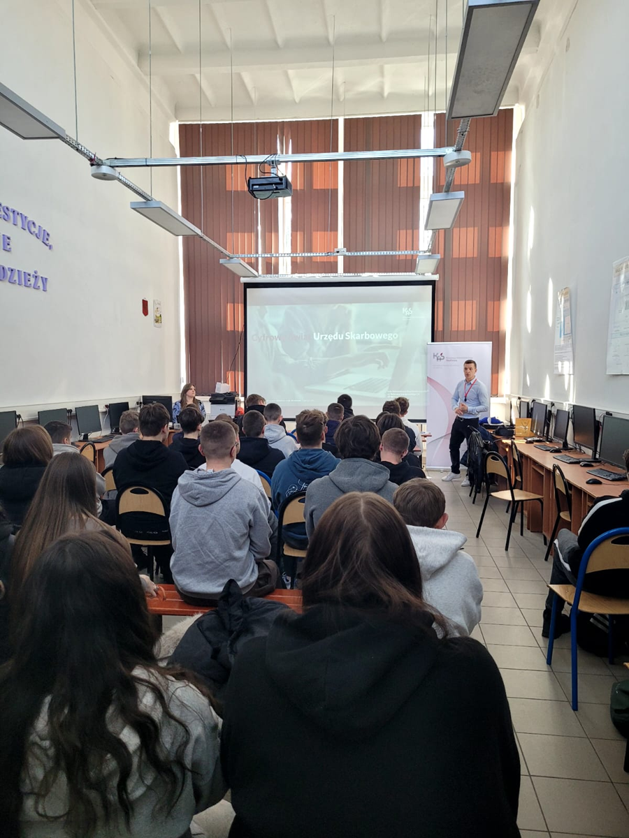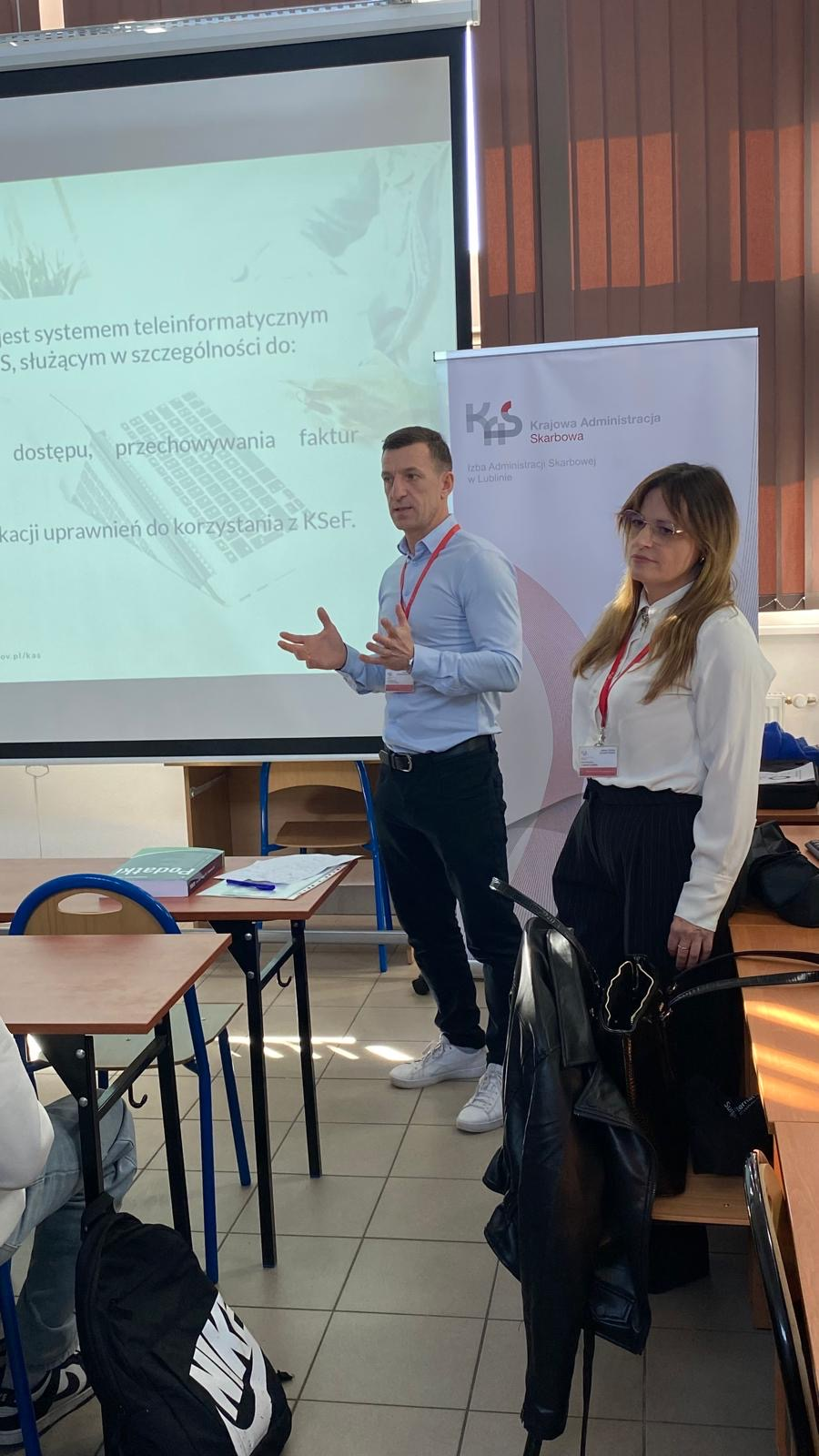 W ramach zorganizowanego szkolenia pracownicy US w Janowie Lubelskim - Pani Joanna Żołynia, Pani Dominika Łozińska oraz Pan Paweł Chmiel przybliżyli uczniom najstarszych klas zagadnienia związane z cyfrowym urzędem skarbowym. Szkolenie przeprowadzone dla młodzieży spotkało się z dużym zainteresowaniem uczestników. W trakcie spotkania okazało się, że część słuchaczy rozważa w przyszłości rozpoczęcie własnej działalności gospodarczej. Z uwagi na to, że w tej grupie wiekowej zdecydowanie preferowane są elektroniczne formy kontaktu w sprawach urzędowych, szczególnym zainteresowaniem cieszyły się zagadnienia dotyczące Krajowego Systemu e-Faktur.