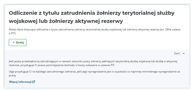 Podatnicy zatrudniający żołnierzy terytorialnej służby wojskowej oraz żołnierzy aktywnej rezerwy rozliczający podatek w usłudze Twój e-PIT podczas składania zeznania rocznego PIT-36 oraz PIT-36L za 2025 rok mogą skorzystać ze specjalnego edytora, który umożliwia dokonanie odliczenia. W edytorze zostały umieszczone komunikaty obejmujące warunki skorzystania z ulgi oraz informacje o wysokości możliwych do odliczenia kwot.