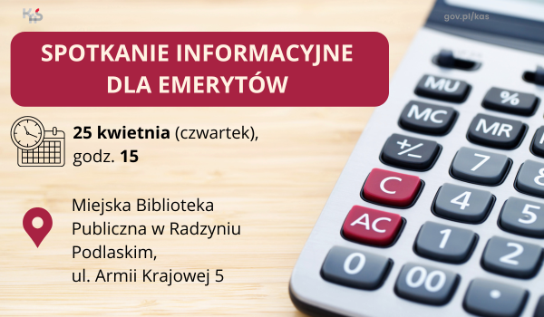 Naczelnik Urzędu Skarbowego w Radzyniu Podlaskim w ramach współpracy z Lubelskim Uniwersytetem II Wieku organizuje 25 kwietnia 2024 roku o godz. 15.00 spotkanie informacyjne dla emerytów. Pracownicy urzędu skarbowego przybliżą seniorom tematykę ulg i zwolnień przysługujących im w podatku dochodowym od osób fizycznych w rozliczeniach rocznych za 2023 rok.
