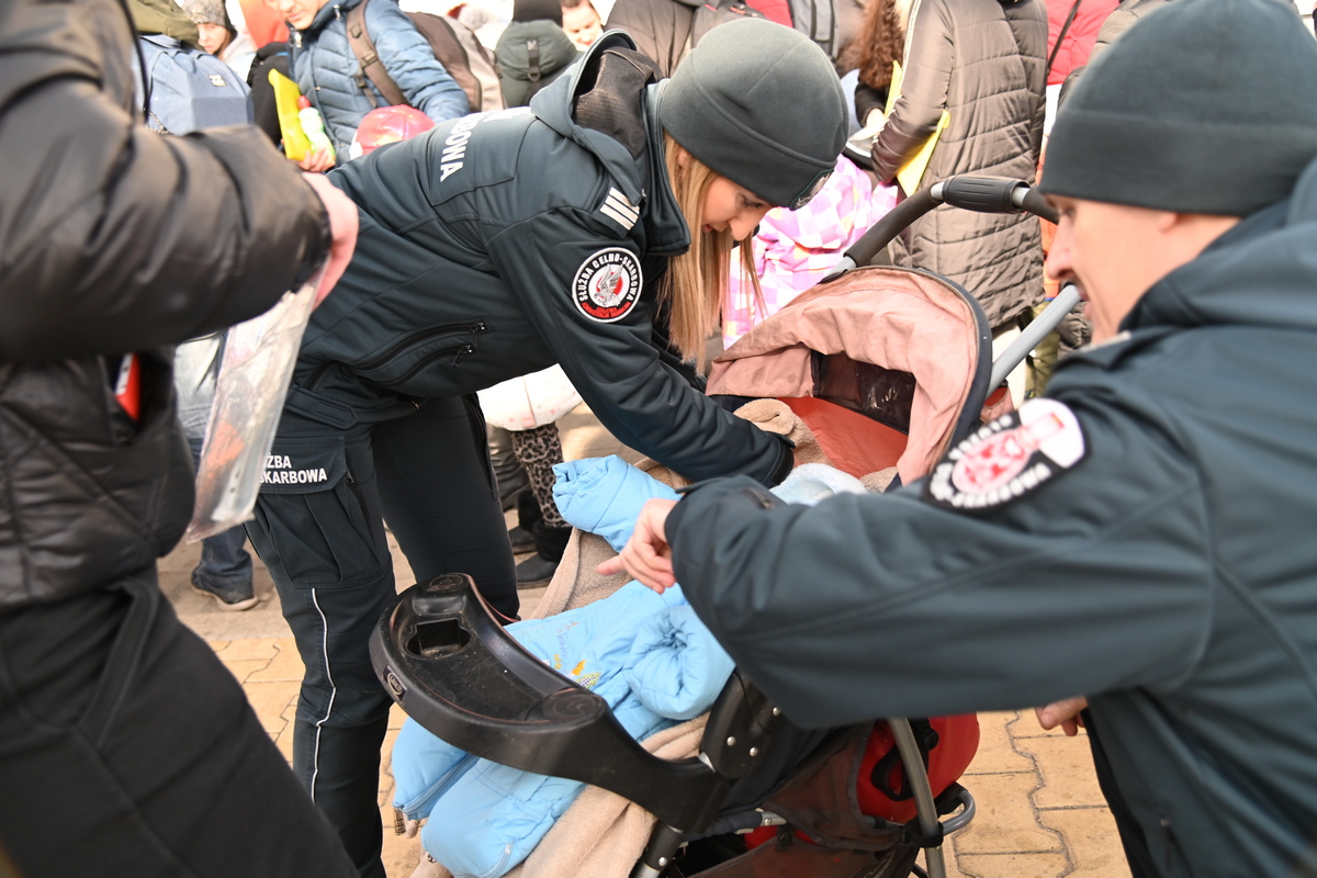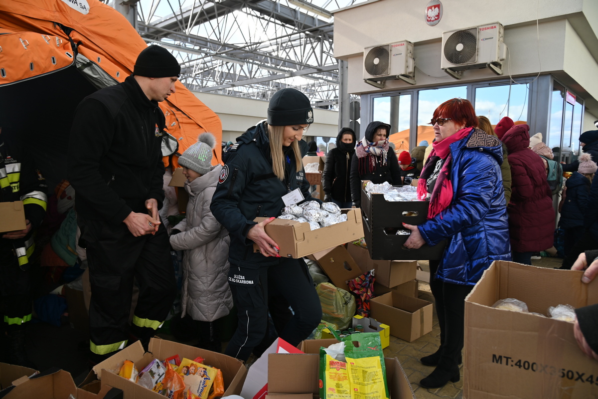 W pierwszych dniach wojny funkcjonariusze Służby Celno-Skarbowej pełniący służbę na przejściach granicznych pomagali w organizowaniu nowej infrastruktury ułatwiającej obsługę osób, adaptacji pomieszczeń na zaplecze dla pomocy rzeczowej oraz punktów dla uchodźców. Na przejściach granicznych zostały utworzone także całodobowe punkty pomocy przedmedycznej i psychologicznej.