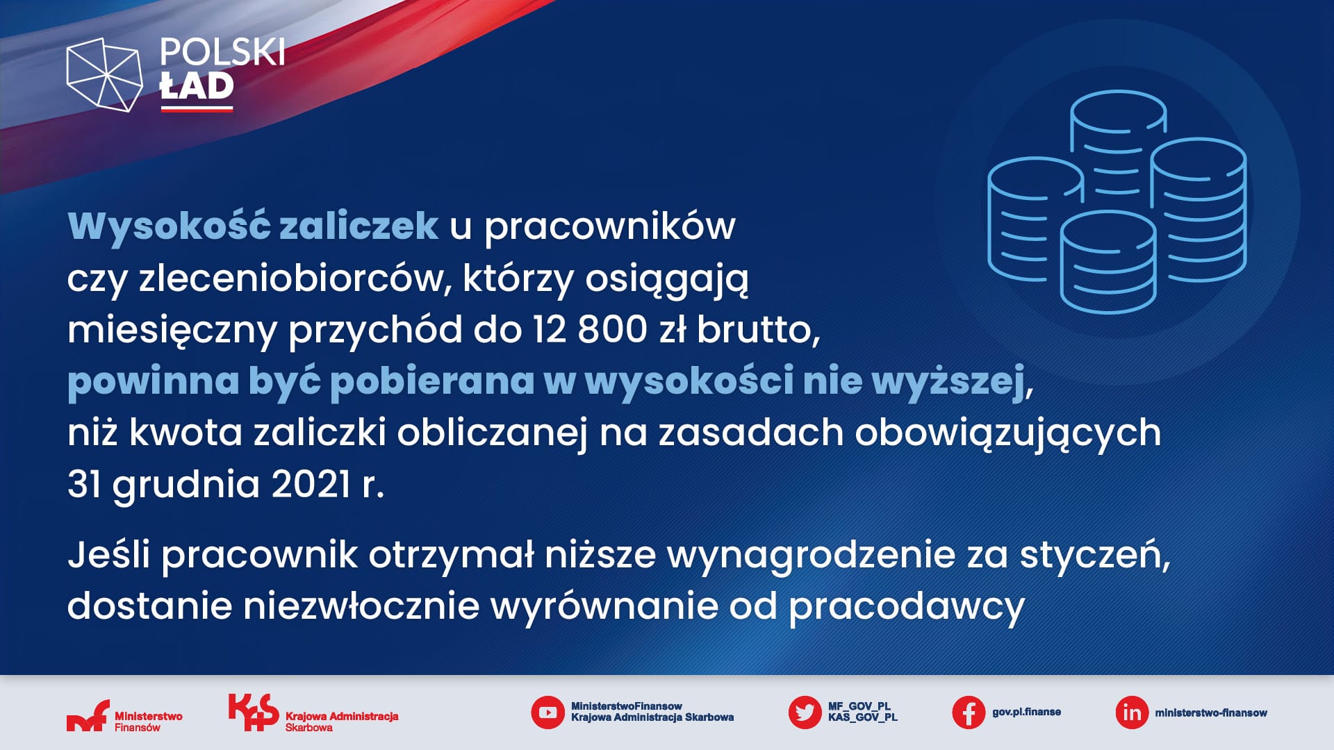 Od 8 stycznia 2022 r. obowiązuje rozporządzenie ministra finansów w sprawie przedłużenia terminów poboru i przekazania przez niektórych płatników zaliczek na podatek dochodowy od osób fizycznych w 2022 r. Na jego mocy wysokość zaliczek, u pracowników czy zleceniobiorców osiągających miesięczny przychód do 12 800 zł brutto, powinna być pobierana w wysokości nie wyższej niż kwota zaliczki obliczanej na zasadach obowiązujących 31 grudnia 2021 r.
