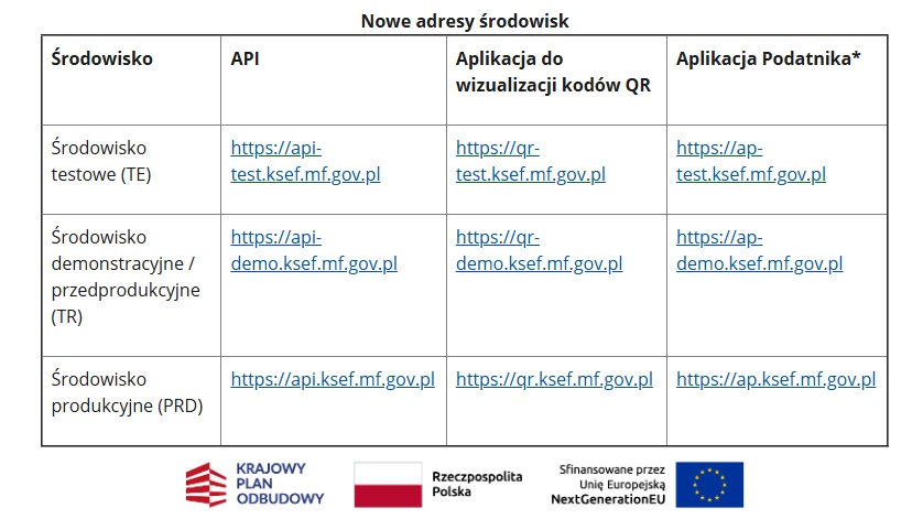 • W związku z przygotowaniami do uruchomienia KSeF 2.0 w środowisku produkcyjnym oraz wdrożeniem docelowej infrastruktury teleinformatycznej i mechanizmów bezpieczeństwa, resort finansów wprowadza nową, jednolitą adresację środowisk KSeF.
